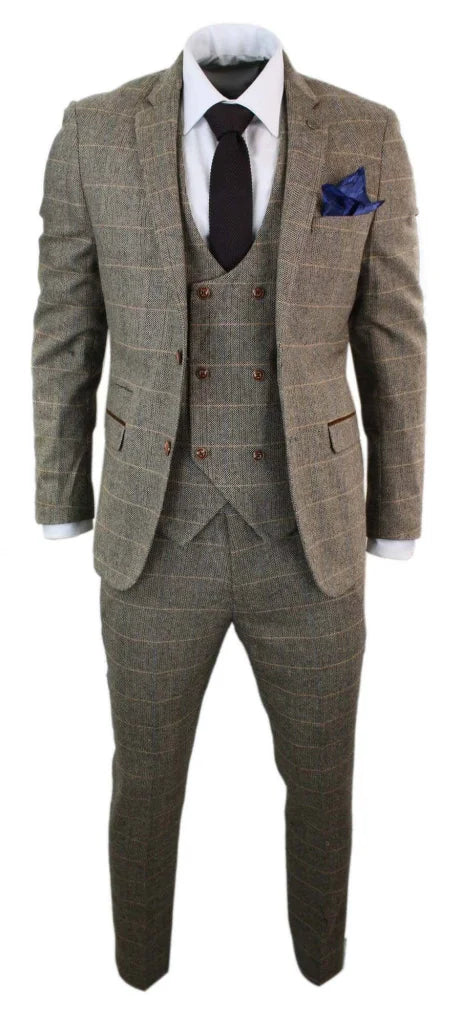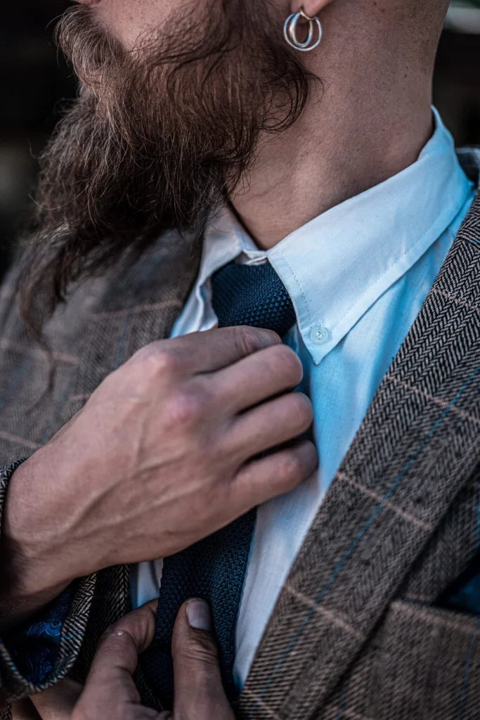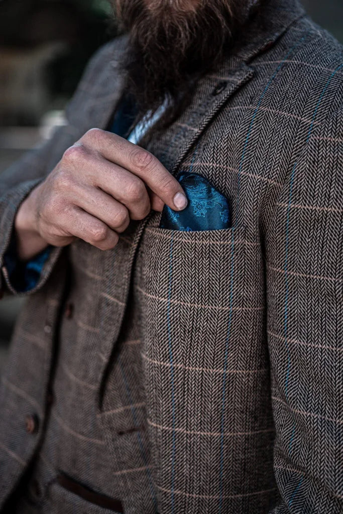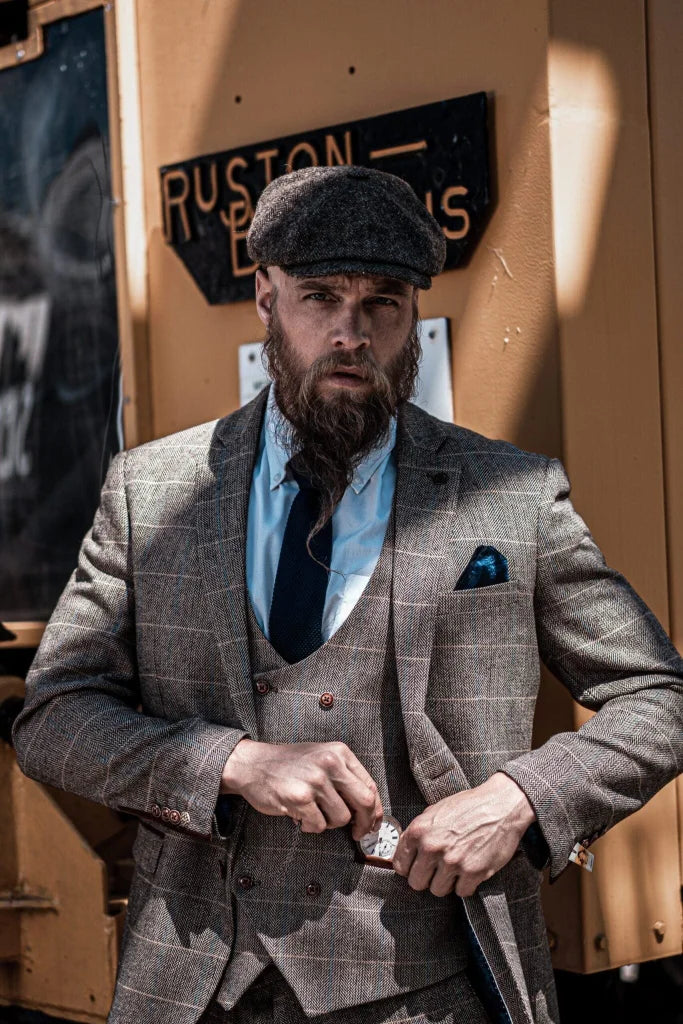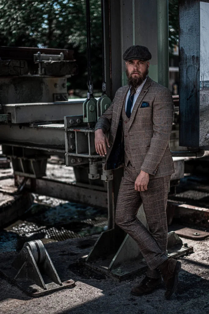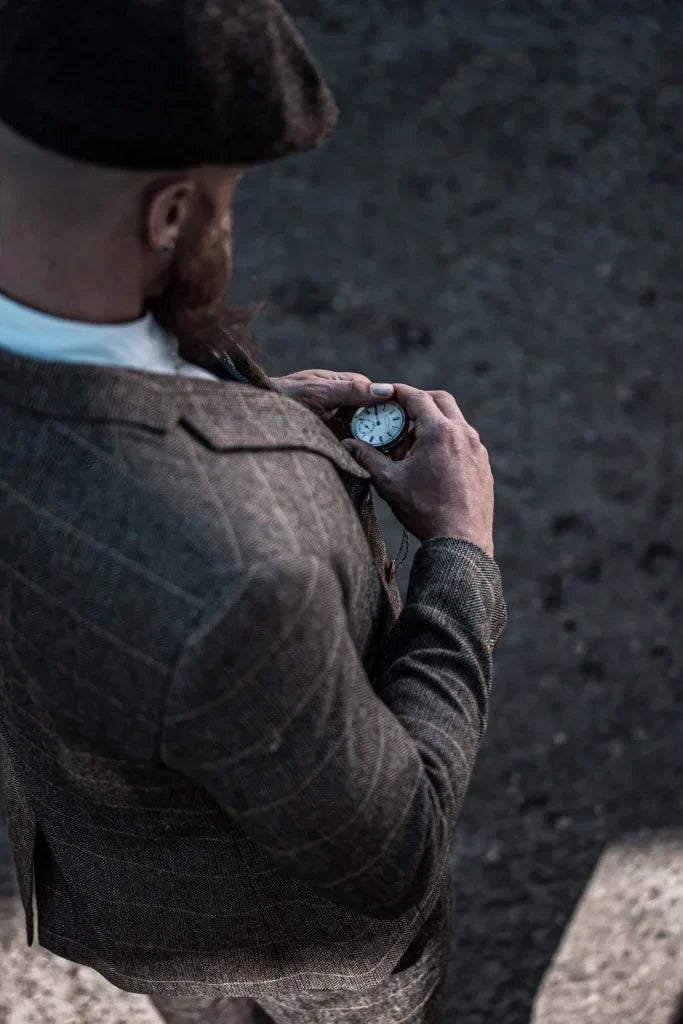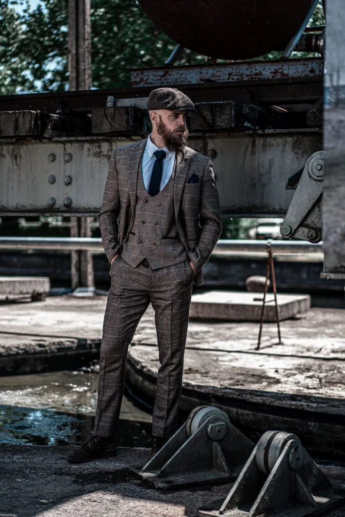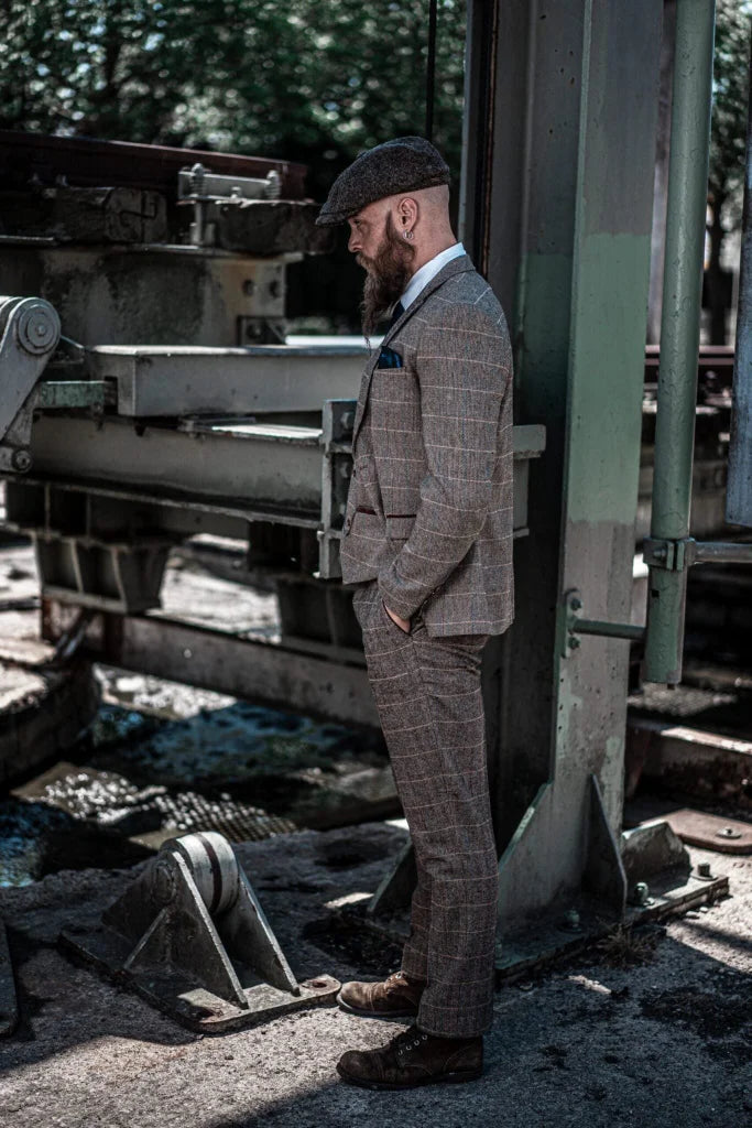 The fit of this three-piece suit? Made for the modern man. Slim, but not tight — a cut that flatters the figure without restricting it. The lines are clean, the shoulders defined, the waist perfectly tailored. The result: a silhouette that radiates class and strength. The check pattern on the waistcoat adds that touch of English finesse — as if you’ve just stepped out of an exclusive London club surrounded by mahogany bookcases and polished tables full of stories.